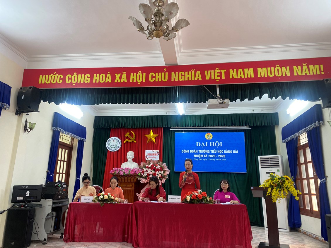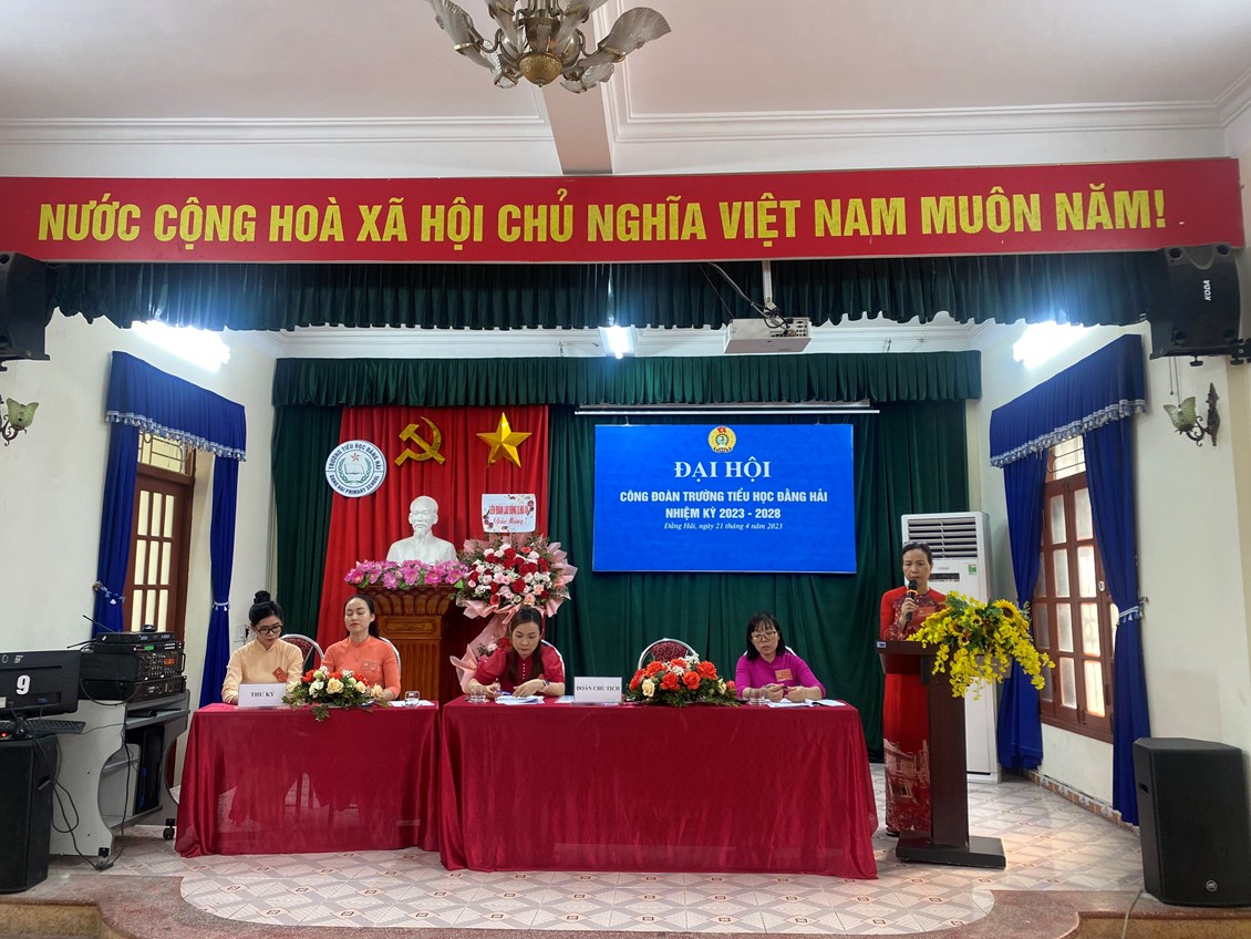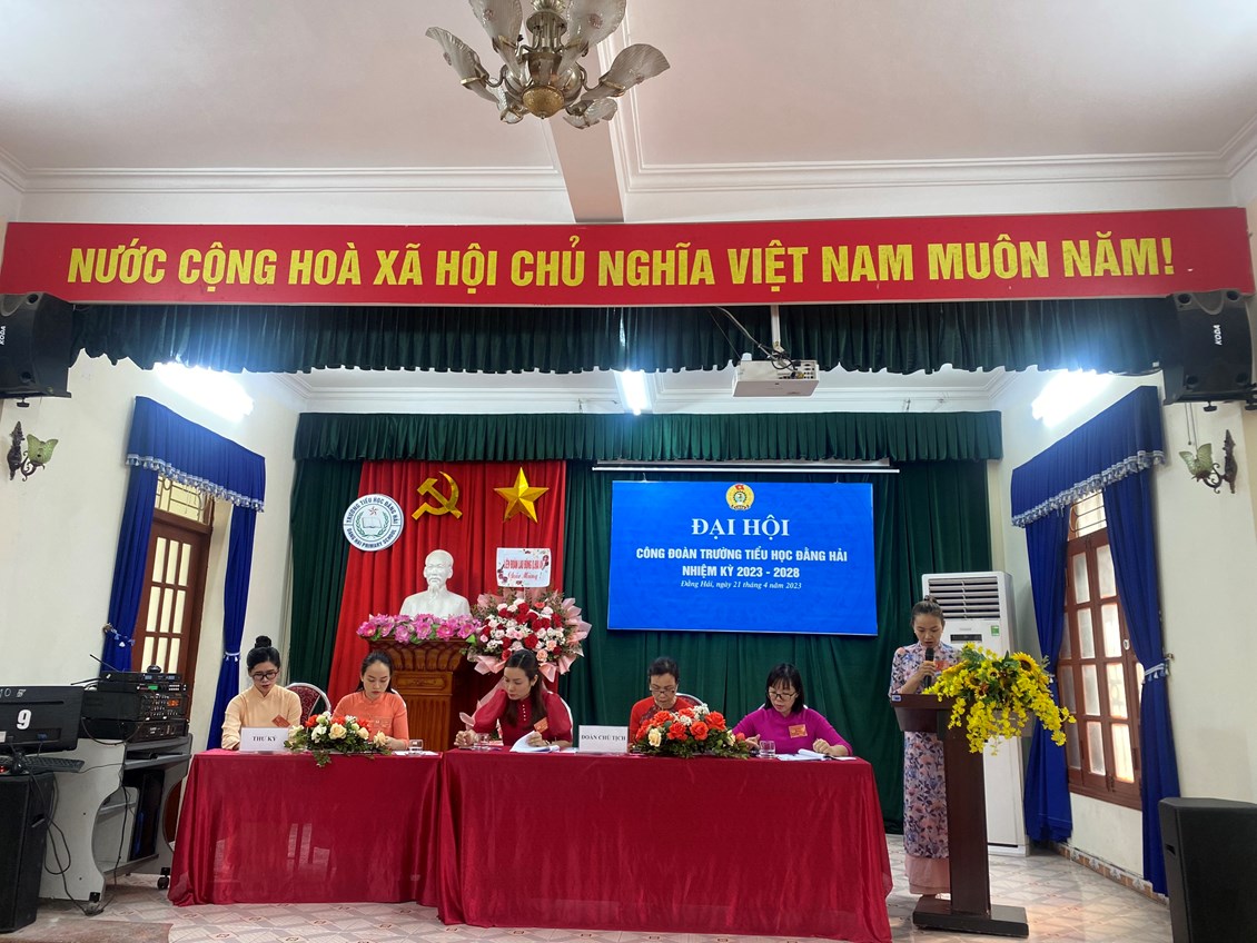 Đại hội đã nghe phát biểu chỉ đạo của đồng chí Bùi Thị Hường - Bí thư chi bộ - Phó hiệu trưởng. Đại hội đã bầu Ban Chấp hành Công đoàn Trường nhiệm kỳ 2023 - 2028 gồm 05 ủy viên và Đoàn đại biểu đi dự Đại hội V công đoàn quận Hải An gồm 03 đại biểu chính thức. Đại hội kêu gọi toàn thể cán bộ, đoàn viên nêu cao tinh thần trách nhiệm, phát huy truyền thống đoàn kết, năng động, sáng tạo, vượt qua khó khăn, thách thức, quyết tâm thực hiện thắng lợi Nghị quyết Đại hội Công đoàn trường Tiểu học Đằng Hải nhiệm kỳ 2023 -2028!