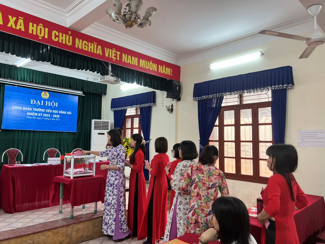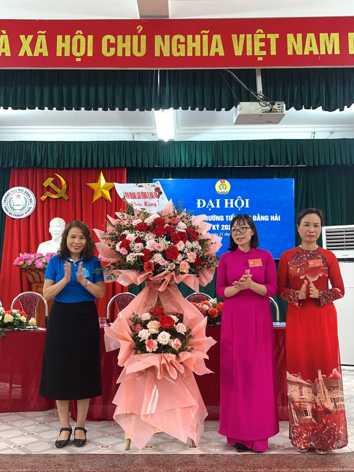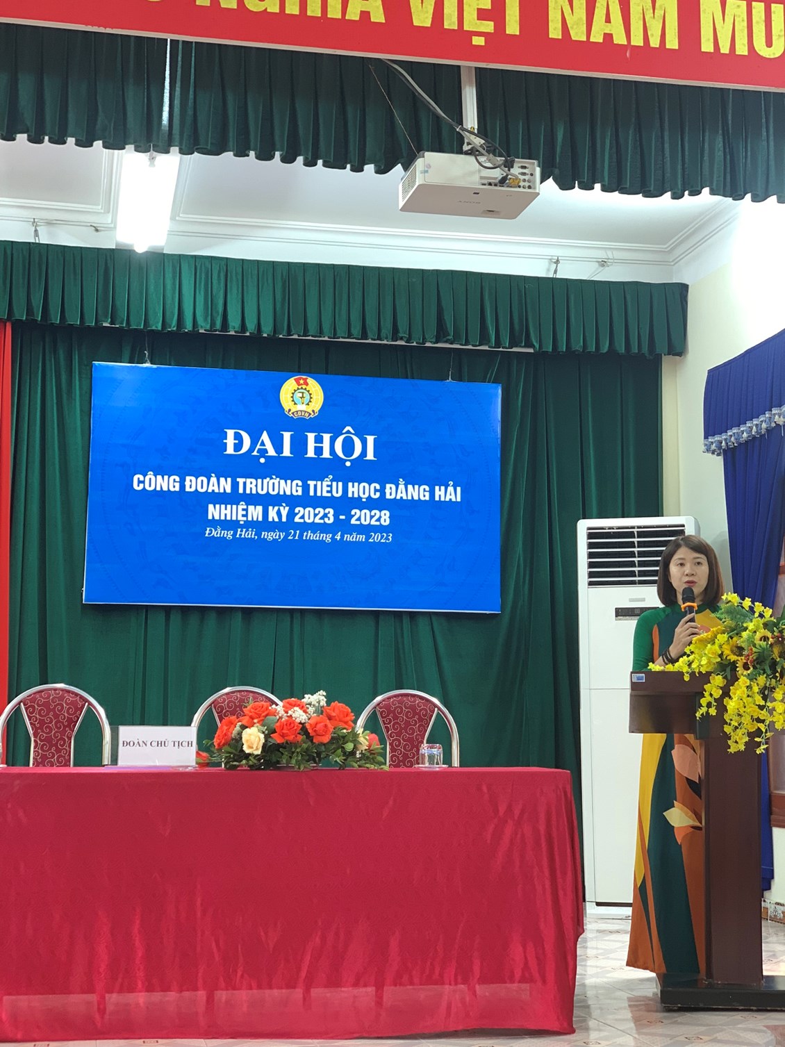 Đại hội đã nghe phát biểu chỉ đạo của đồng chí Bùi Thị Hường - Bí thư chi bộ - Phó hiệu trưởng. Đại hội đã bầu Ban Chấp hành Công đoàn Trường nhiệm kỳ 2023 - 2028 gồm 05 ủy viên và Đoàn đại biểu đi dự Đại hội V công đoàn quận Hải An gồm 03 đại biểu chính thức. Đại hội kêu gọi toàn thể cán bộ, đoàn viên nêu cao tinh thần trách nhiệm, phát huy truyền thống đoàn kết, năng động, sáng tạo, vượt qua khó khăn, thách thức, quyết tâm thực hiện thắng lợi Nghị quyết Đại hội Công đoàn trường Tiểu học Đằng Hải nhiệm kỳ 2023 -2028!