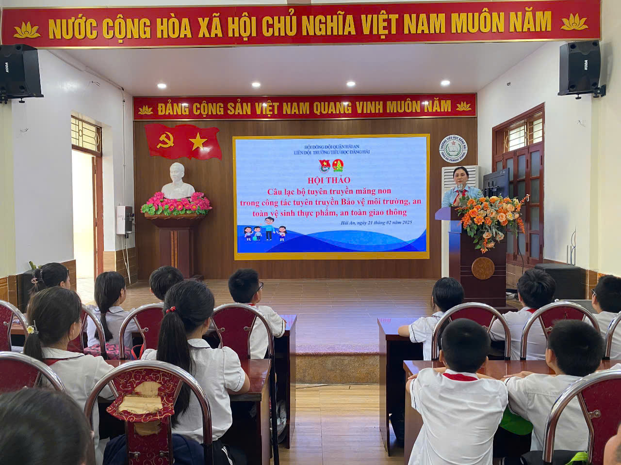 Thực hiện chương trình công tác Đội và phong trào thiếu nhi năm học 2024-2025, nhằm nâng cao nhận thức cho đội viên về bảo vệ môi trường, an toàn vệ sinh thực phẩm và an toàn giao thông, Liên đội Trường Tiểu học Đằng Hải đã chủ động triển khai và duy trì hiệu quả hoạt động của Đội tuyên truyền măng non cùng Câu lạc bộ "Phóng viên nhỏ tuổi" với nhiều hoạt động phong phú và sôi nổi.