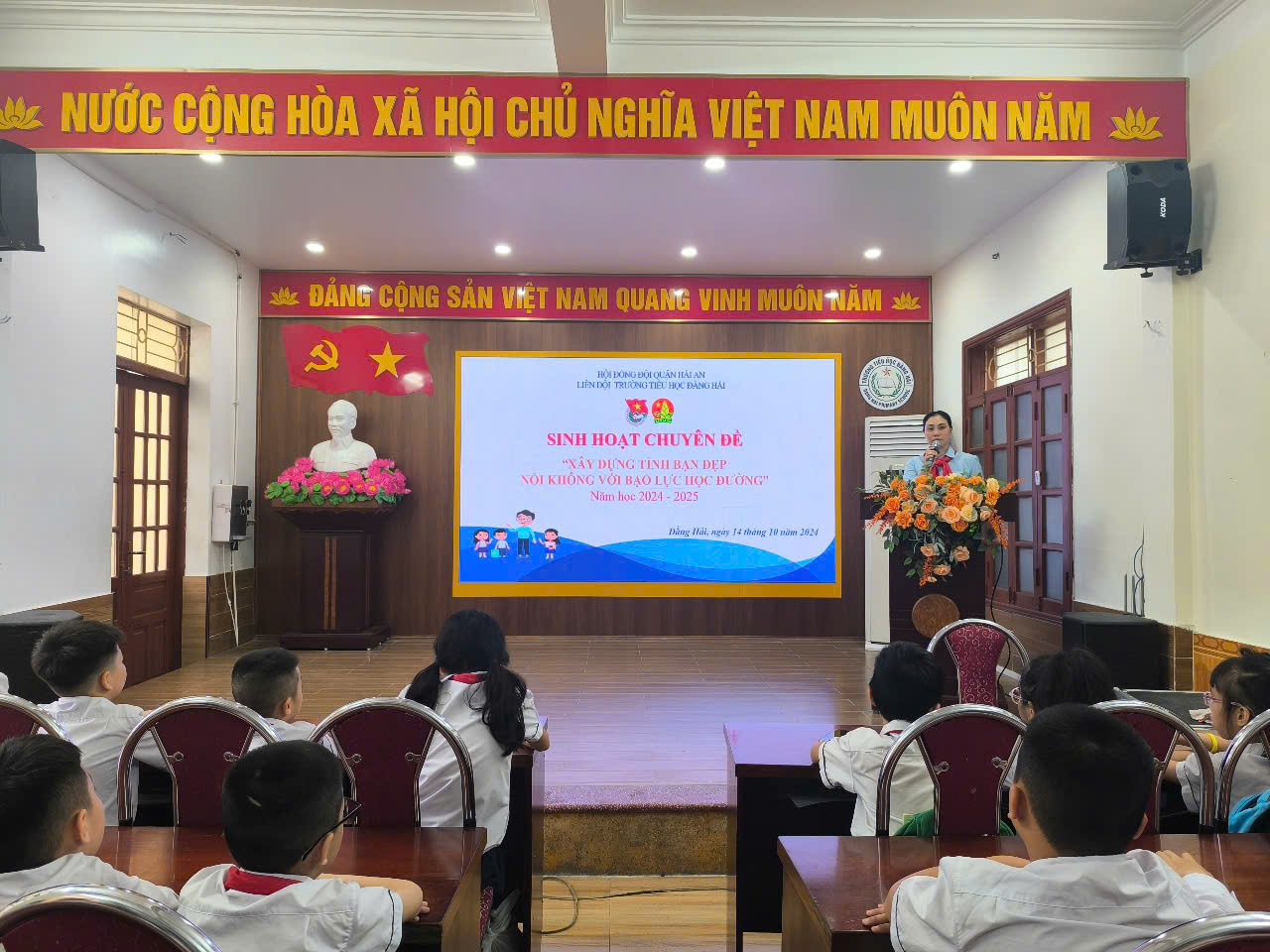 Nhằm tăng cường giải pháp phòng chống bạo lực học đường trong trường học, góp phần giáo dục ý thức, đạo đức, lối sống văn hóa cho học sinh, đồng thời tạo sân chơi rèn luyện sức khỏe, tăng cường sự giao lưu tình đoàn kết giữa học sinh, Liên đội Tiểu học Đằng Hải đã tổ chức chuyên đề “Xây dựng tình bạn đẹp - Nói không với bạo lực học đường” vào ngày 14/10/2024.