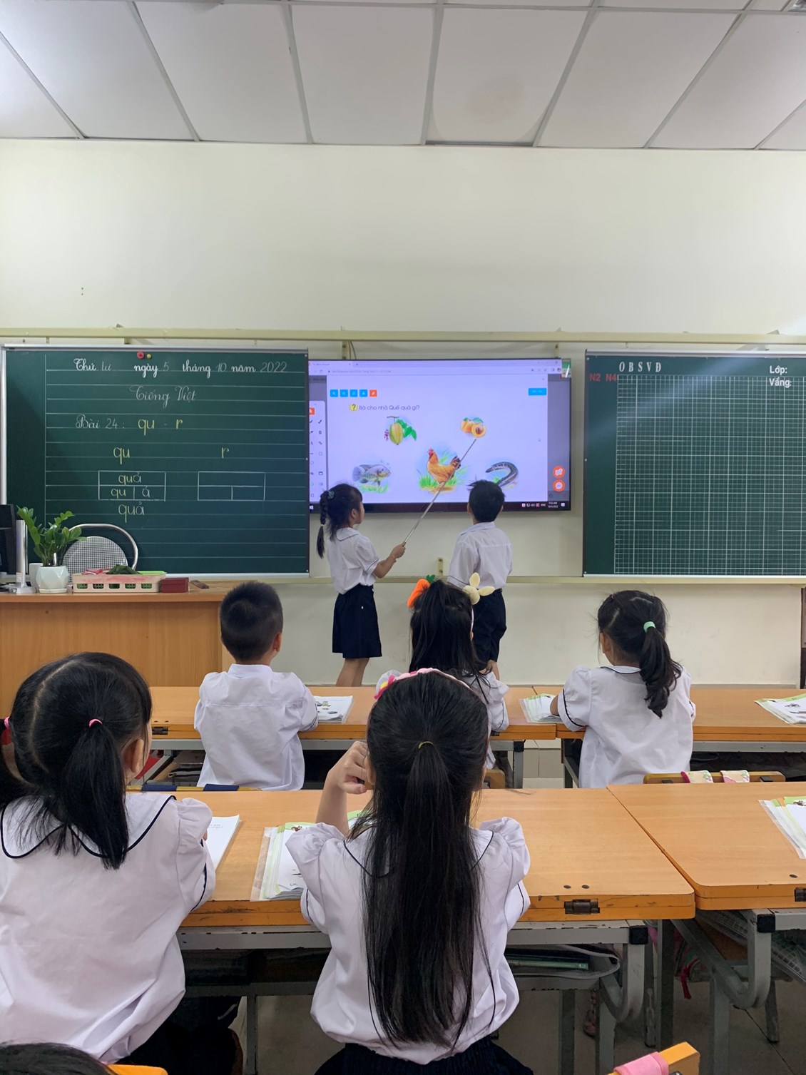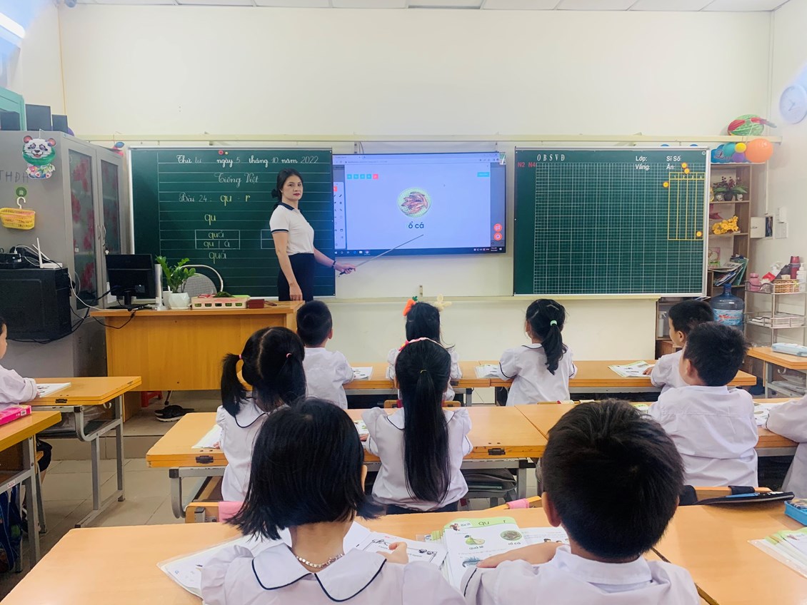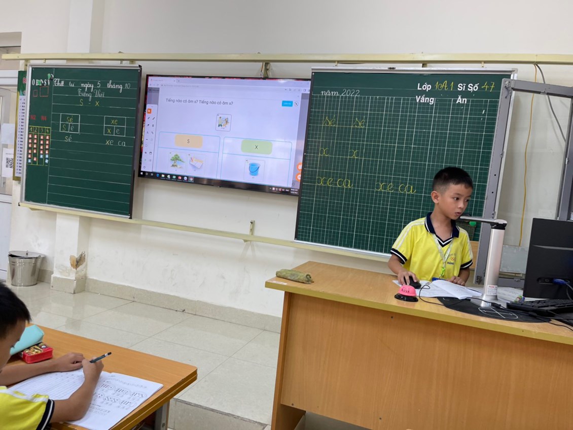 Việc ứng dụng CNTT vào dạy học có vai trò quan trọng trong giáo dục hiện nay, là một trong những nhiệm vụ trọng tâm góp phần đổi mới giáo dục và thực hiện chuyển đổi số. Mỗi bài giảng của giáo viên đã trở nên sinh động, hấp dẫn, gần gũi hơn với học sinh nhờ việc áp dụng CNTT vào bài dạy. Học sinh thực sự hào hứng, thu hút vào các hoạt động học tập. Dưới đây là một số hình ảnh các tiết học áp dụng CNTT của các em học sinh khối 1: