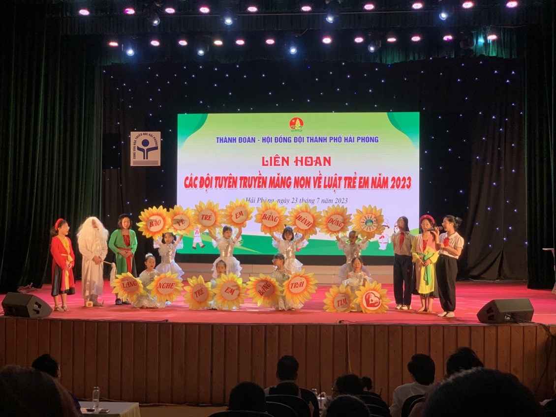 Chiều ngày 23/7/2023 các em học sinh nhà trường đã đại diện cho Quận Đoàn Hải An tham gia " Liên hoan các đội tuyên truyền măng non về Luật trẻ em" năm 2023. Các em HS đã xuất sắc vượt qua 2 phần thi kiến thức và phần thi tuyên truyền là 3 đội có số điểm cao nhất trong số 14 quận huyện vào tham gia phần thi kỹ năng và đạt giải nhì trong liên hoan.