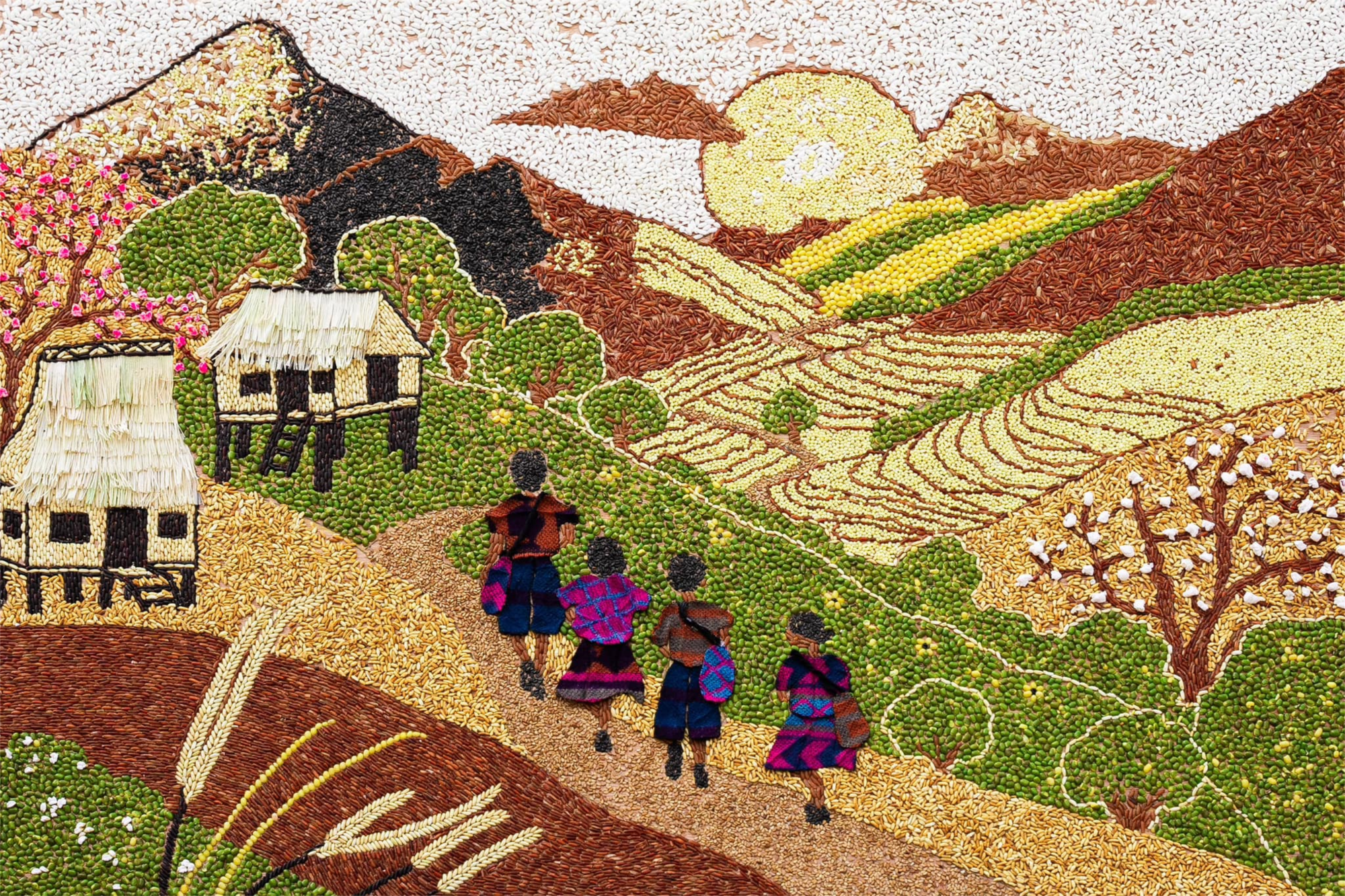 - Bức tranh Đôi bàn chân em: Vật liệu hạt gạo, hạt ngô, hạt đỗ, hạt kê