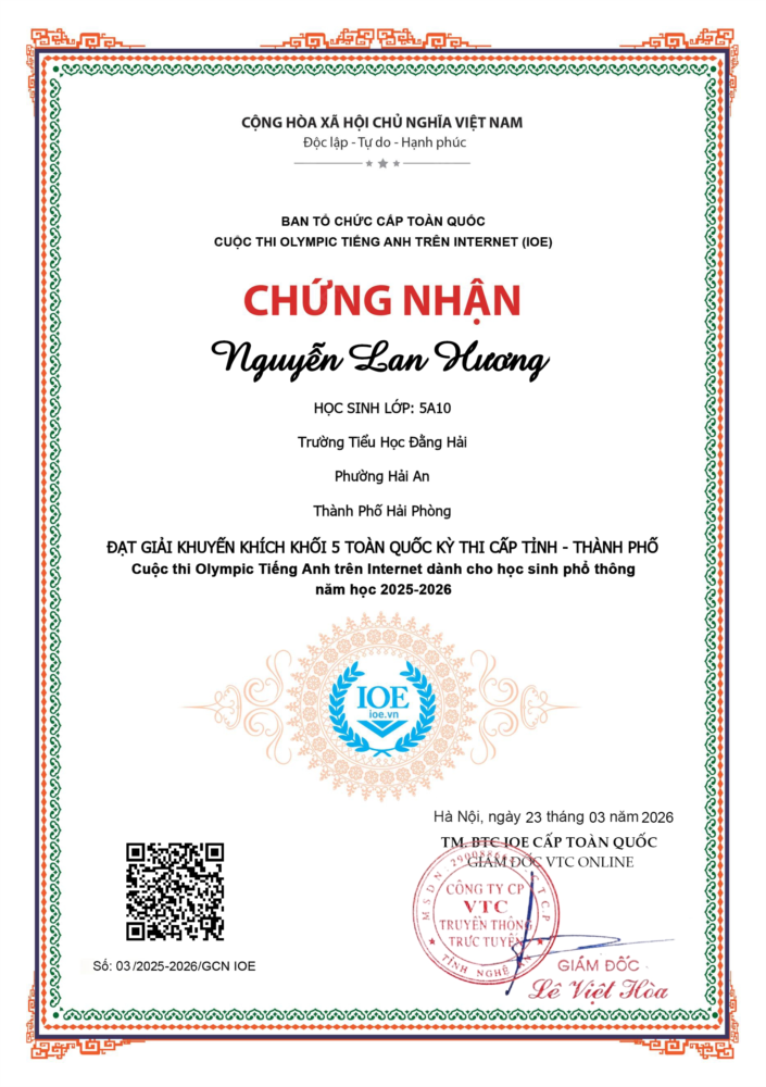 🌟 Trường Tiểu học Đằng Hải, phường Hải An xin trân trọng vinh danh các em học sinh đã xuất sắc đạt thành tích cao trong Cuộc thi Olympic Tiếng Anh trên Internet (IOE) năm học 2025 – 2026.