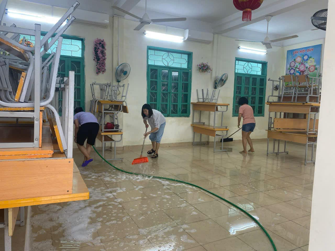 ☘️Cơn mưa sau bão tiếp tục biến sân trường thành" biển nước", nước tràn vào cả các phòng học; 3-4 giờ sáng các thầy cô giáo đã gọi nhau đến trường để chuyển bàn ghế lên cao tránh nước. Nước rút rồi, sáng nay (12/9), các thầy cô lại tiếp tục dọn dẹp toàn bộ khuôn viên nhà trường.
